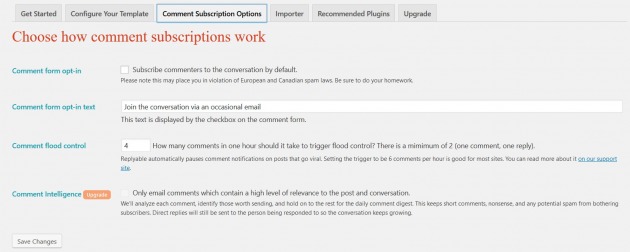 Nếu bạn đã chọn chấp nhận với cuộc đàm thoại một chiều, plugin này sẽ gửi một thông báo đơn giản khi bình luận đã được đăng. Bạn có thể tùy chỉnh mẫu email của bạn ,chọn một bảng màu, tiêu đề email và nội dung chân trang. Hơn nữa, bạn có thể thêm tùy chọn đăng ký bình luận.