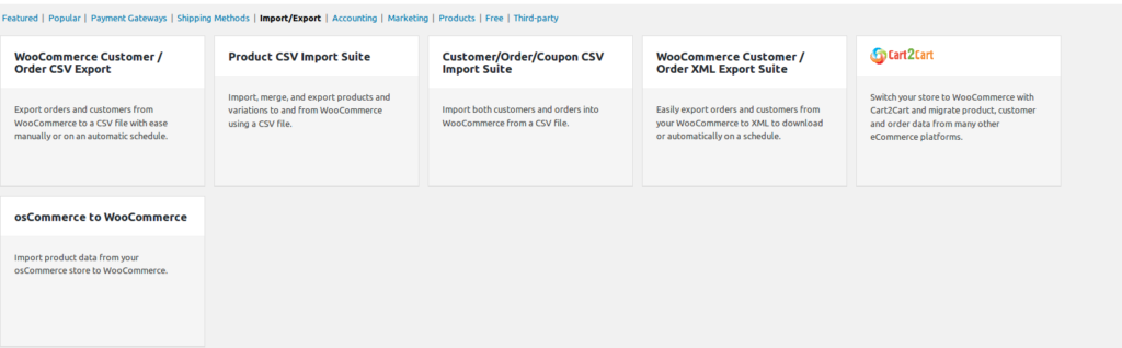 Sau khi cài đặt WooCommerce trên trang web WordPress của bạn, bạn cần mua bộ nhập dữ liệu của WooCommerce để nhập các tệp .csv. Để mua extension này, bạn truy cập WooCommerce > Extension trong quản trị WordPress, và nhấn ‘Import/Export’.
