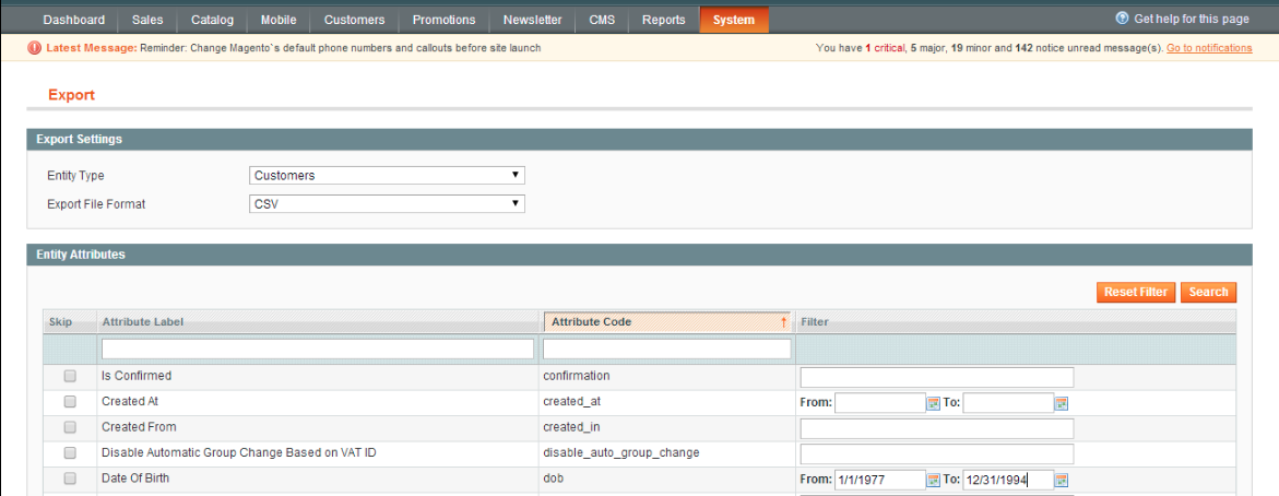Bây giờ bạn phải tạo tệp dữ liệu .csv từ Magento, ví dụ: sản phẩm, đơn đặt hàng, khách hàng, v.v … Để tạo tệp .csv bạn đăng nhập vào quản trị Magento, và chọn System > Import/Export > Export.