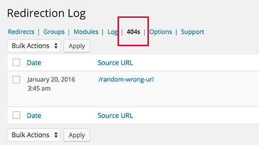 Plugin chuyển hướng cũng có tùy chọn để theo dõi 404s. Chỉ cần nhấp vào liên kết 404 ở trên cùng và plugin sẽ hiển thị cho bạn các lỗi 404 gần đây xảy ra trên trang web của bạn kể từ khi bạn cài đặt plugin.