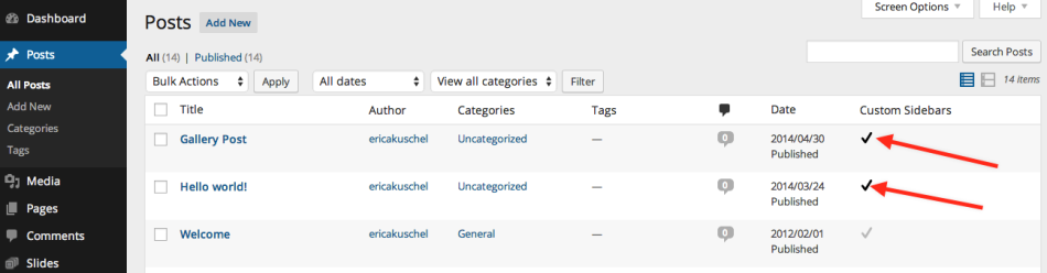 Lưu ý: tab ‘Posts’ ở hình trên sẽ chỉ hiển thị nếu bạn kích hoạt Custom Sidebars cho từng post như mô tả ở ngay bên dưới.