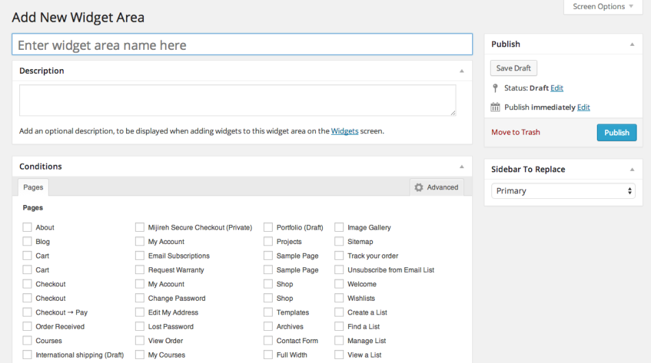 Đặt tên dễ nhớ cho widget, bạn nên sử dụng tên ngắn & có liên quan (vd ‘About Page – Primary’, để thay thế sidebar ‘Primary’ trên trang ‘About’).