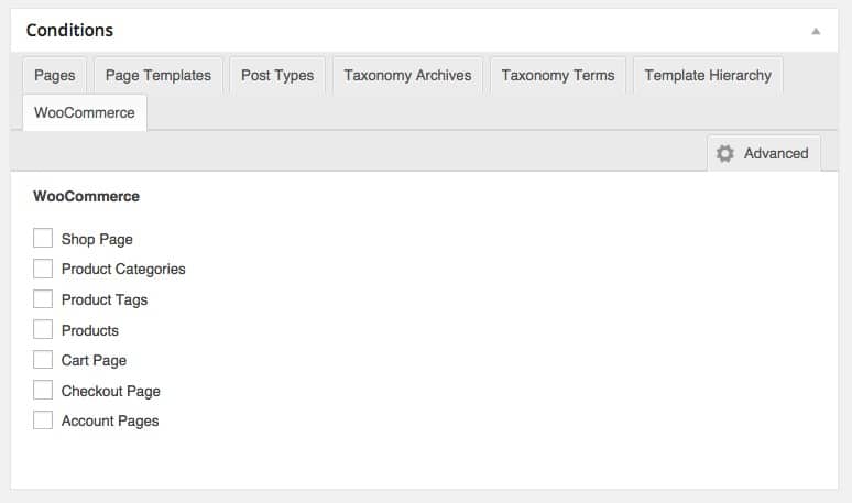 WooSidebars hiển thị các điều kiện với trang theo mặc định. Để thêm các điều kiện khác, dưới phần “Conditions” bạn nhấn vào tab “Advanced”: