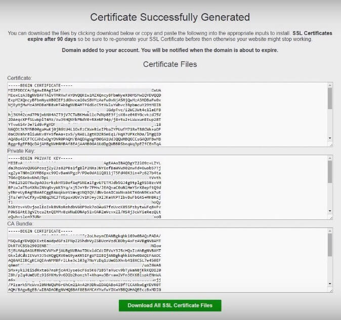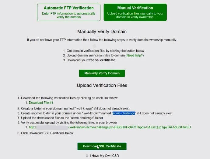 Nếu SSLforfree.com xác minh thành công tên miền của bạn, bạn sẽ nhận được chuỗi chứng chỉ bằng cách sau khi nhấn vào nút “download SSL certificate”. Bạn có thể bỏ tùy chọn “I Have My Own CSR”