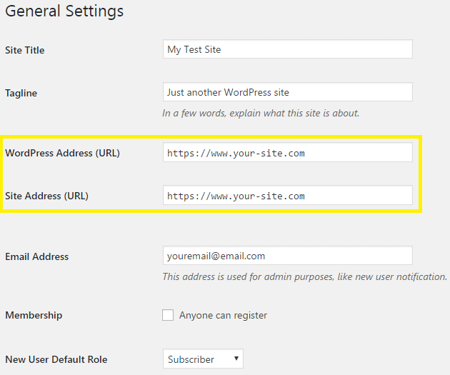 Thay http:// thành https:// ở mục “WordPress Address (URL)” và “Site Address (URL)”. Xem hình sau: