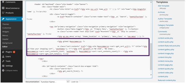 Trong ví dụ này, chúng tôi sẽ thêm thông tin giỏ hàng ngay bên dưới menu điều hướng. Chúng ta chèn mã ngay sau thanh điều hướng wp_nav_menu.