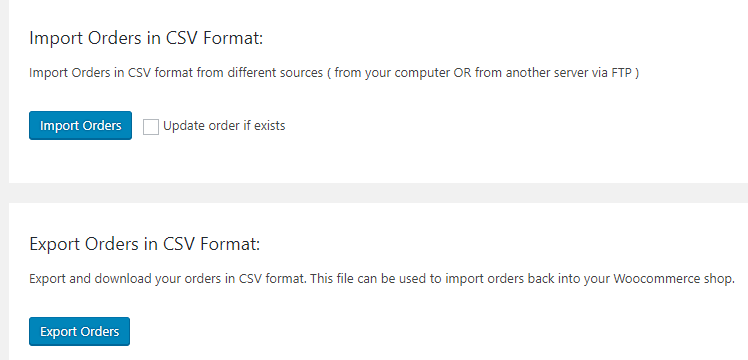 Bạn có thể dễ dàng nhập và xuất đơn hàng từ các cửa hàng WooCommerce. Lưu ý rằng các tập tin tải về sẽ có định dạng CSV. Kiểm tra hai ảnh chụp sau đây: