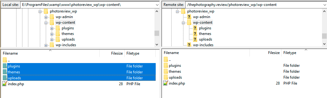Bước tiếp theo, bạn sẽ sao lưu thư mục themes, plugins, uploads, trong thư mục wp-content từ website bạn muốn di chuyển & lên thư mục wp-content trên hosting sử dụng trình tải tệp FTP.