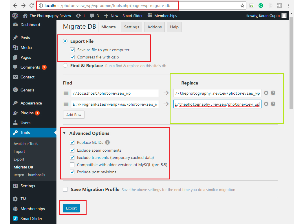 Trước tiên bạn cài đặt plugin WP Migrate DB tại đây. Sau khi kích hoạt plugin bạn truy cập Tools->WP Migrate DB. Ở tab đầu tiên, bạn chọn “Export File” và làm theo hình dưới.