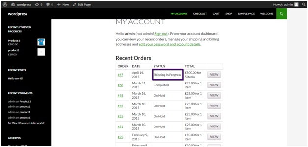 Mình muốn chứng mình cho các bạn thấy, để đơn giản mình sửa đơn hàng trên sang trạng thái mới này & nhấn nút lưu để lưu đơn hàng. Bây giờ trên giao diện website, mình chuyển đến trang tài khoản. Khi nhấn vào link “My Account” một danh sách những đơn hàng hiện ra & có xuất hiện trạng thái mới của mình vừa thêm ở đây.