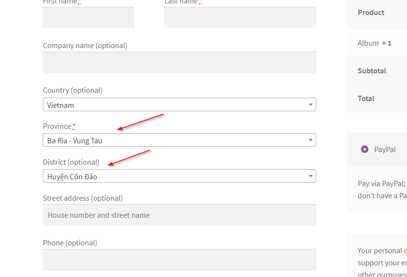 Vậy là xong, để thấy được trường quận huyện bạn thử thêm vài sản phẩm vào giỏ hàng và chuyển đến trang thanh toán, bạn sẽ thấy thêm 2 trường mới như thế này.