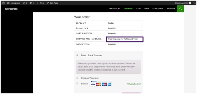 Sau khi cấu hình hoàn tất, hãy thử thêm các sản phẩm vào giỏ hàng sao cho thỏa mãn với một trong số các điều kiện , ở đây mình chọn quốc gia Pakistan và bạn sẽ thấy tùy chọn giao hàng miễn phí xuất hiện như hình dưới đây.