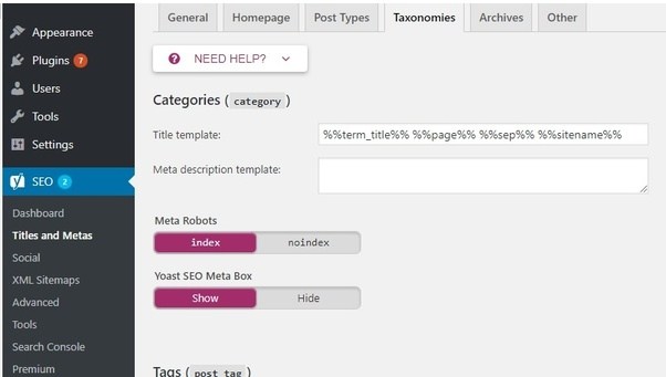 - Titles & METAS và nhấp chuột vào tab Taxonomies.