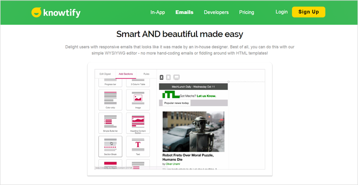 Knowtify làm nổi bật trên thị trường vì một trình soạn thảo email cho dịch vụ tiếp thị qua email của họ bởi dễ sử dụng và tính linh hoạt.