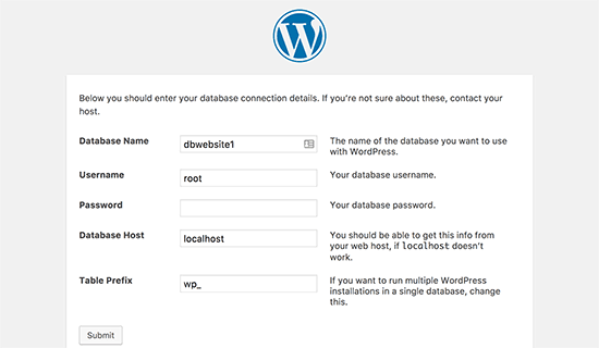 Theo mặc định, bạn chỉ cần điền thông tin cơ sở dữ liệu trong khi cài đặt WordPress. Nếu bạn không có sẵn tệp wp-config.php, thì bạn sẽ được yêu cầu tạo một tệp bằng cách điền thông tin cơ sở dữ liệu của bạn.
