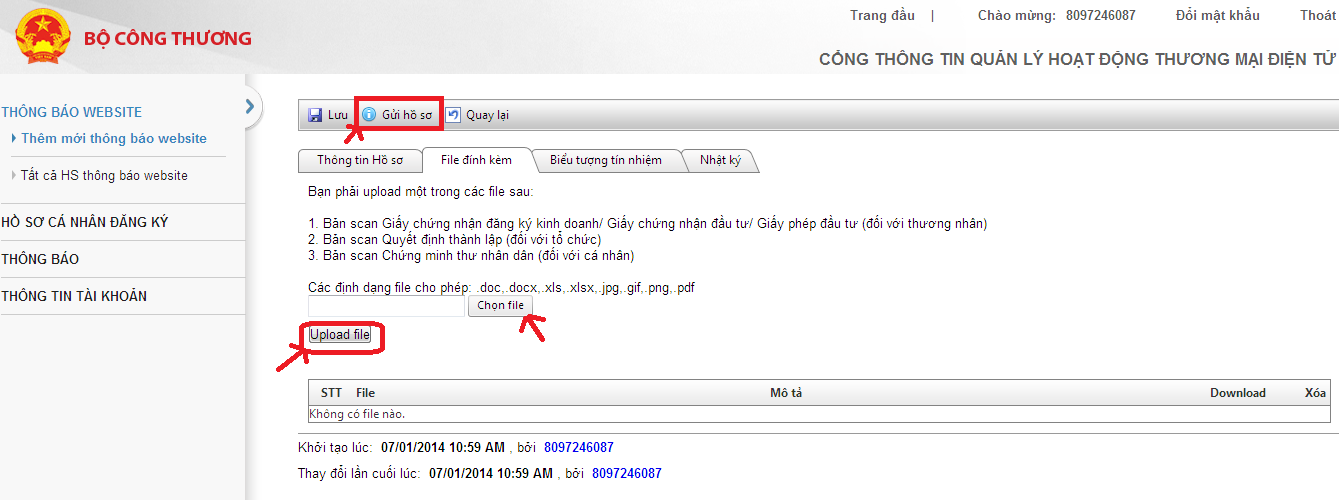 • Upload File thành công, chọn “Gửi hồ sơ” để hoàn thành việc đăng ký thông báo website bán hàng