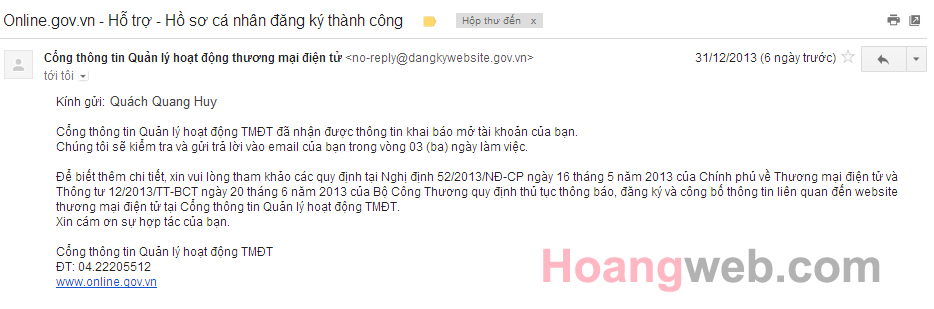 – Bạn sẽ nhận được email từ bộ công thương, bộ công thương sẽ tiến hành duyệt thông tin đăng ký của bạn trong 3 ngày làm việc và gửi lại email phản hồi về việc bạn đã đăng ký thành công hay chưa