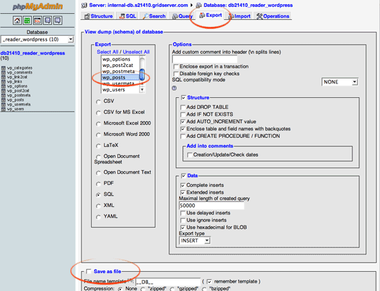 Bước đầu tiên, bạn cần xuất dữ liệu bảng wp_posts bằng cách tạo file .sql cho bảng này từ phpMyadmin. Từ giao diện phpMyadmin, nhấn tab Export nhấn chọn bảng wp_posts & nhấn “Save as File” để lưu file về máy tính.