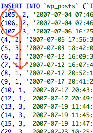 Bây giờ bạn cần nhập lại ID mới cho mỗi dòng Post trong file .sql, bắt đầu sau chỉ số từ Post ID cuối cùng của file sql thứ hai. Nếu bạn bỏ qua bước này & khi nhập dữ liệu sẽ có nhiều dữ liệu bị trùng lặp và quá trình nhập sẽ bị lỗi, không thành công. Hãy làm như thế này: