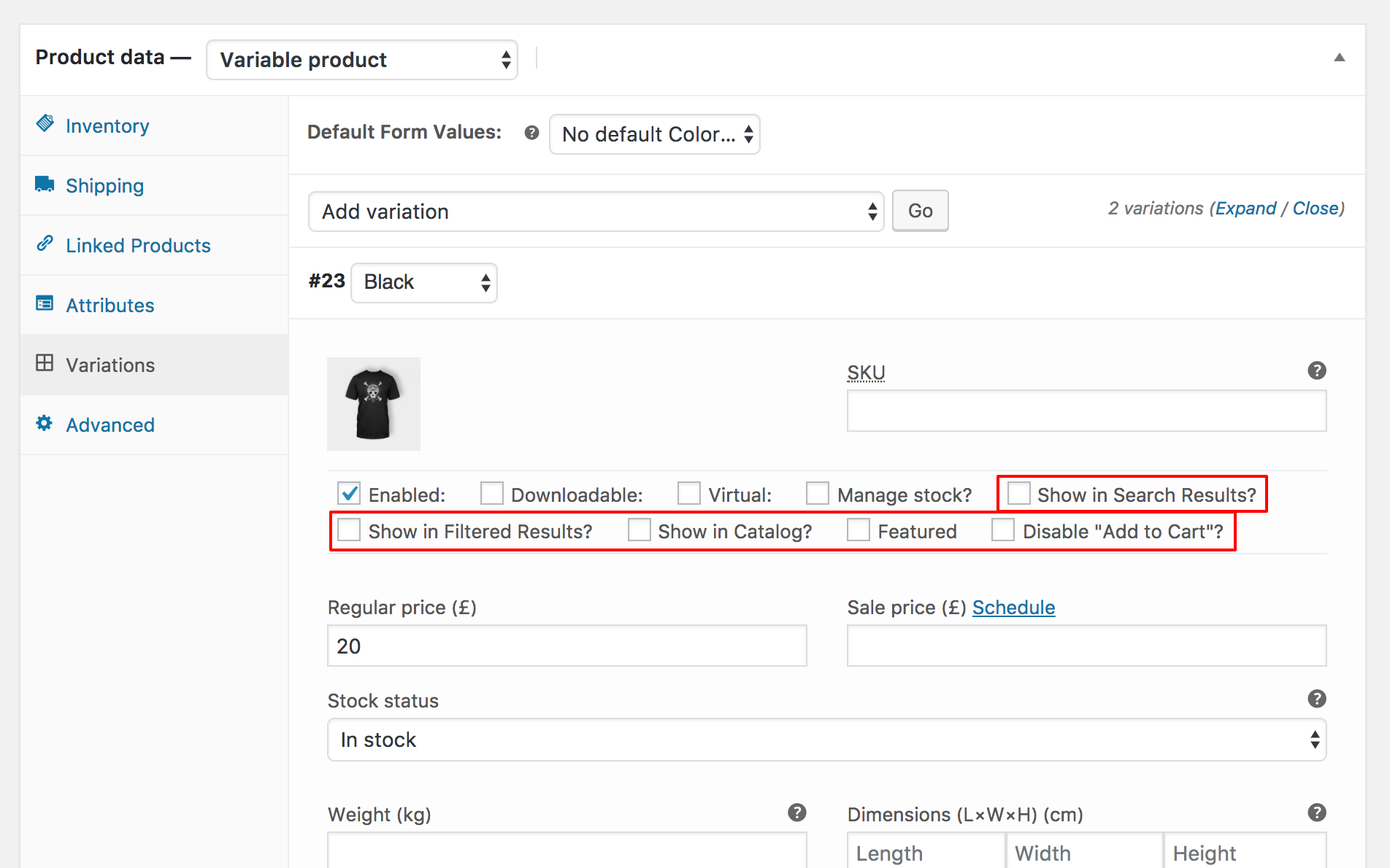 Bước kế tiếp bạn cần kích hoạt các sản phẩm biến thể hiển thị trên trang cửa hàng. Tại trang sửa sản phẩm, chuyển sang tab Variations và chọn một biến thể bạn muốn kích hoạt.