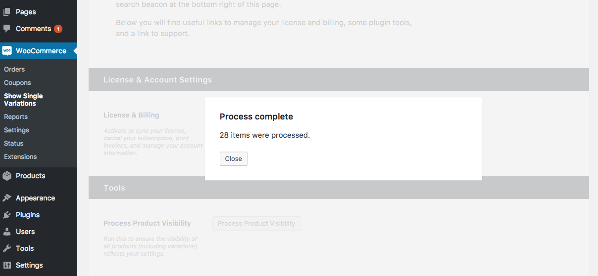 Trên trang cài đặt này, bạn nên nhấn nút “Process Product Visibility” để quét và sử lý mặc định cho toàn sản phẩm có biến thể của bạn. Bởi vì mặc định các biến thể không hiển thị cho đến khi bạn kích hoạt nó.