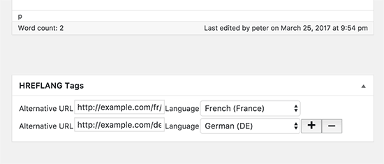 Đầu tiên bạn cần thêm URL của bài đăng mà bạn hiện đang chỉnh sửa và sau đó chọn ngôn ngữ của nó. Sau đó bạn cần nhấp vào nút cộng để thêm các URL của các biến thể khác của bài viết và ngôn ngữ của nó.